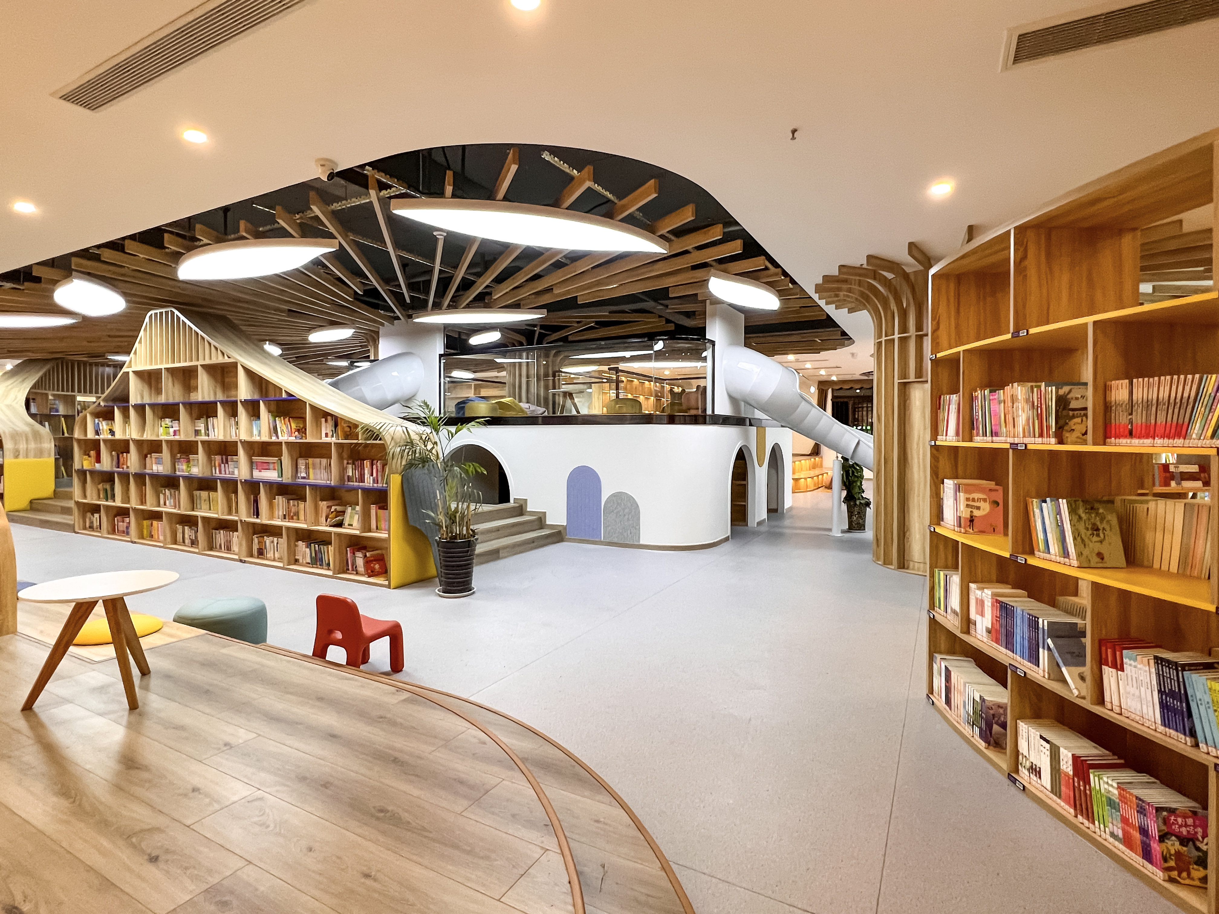 总面积650平,藏书室460平方米,藏书27177册,电子图书4000册,电子期刊300册,图书馆整体采用阅、教、娱一体的设计理念,有绘本区、藏书区、阅读区、阅读分享区、电子阅览区、研讨室、舞台展示区等,另富有童趣的滑梯和树洞设计让孩子更快乐的阅读。图书馆配备先进的智能化设备,包括图书智能化管理系统、自助借还、VR阅读、大数据展示等,实现了图书馆的智能化管理。