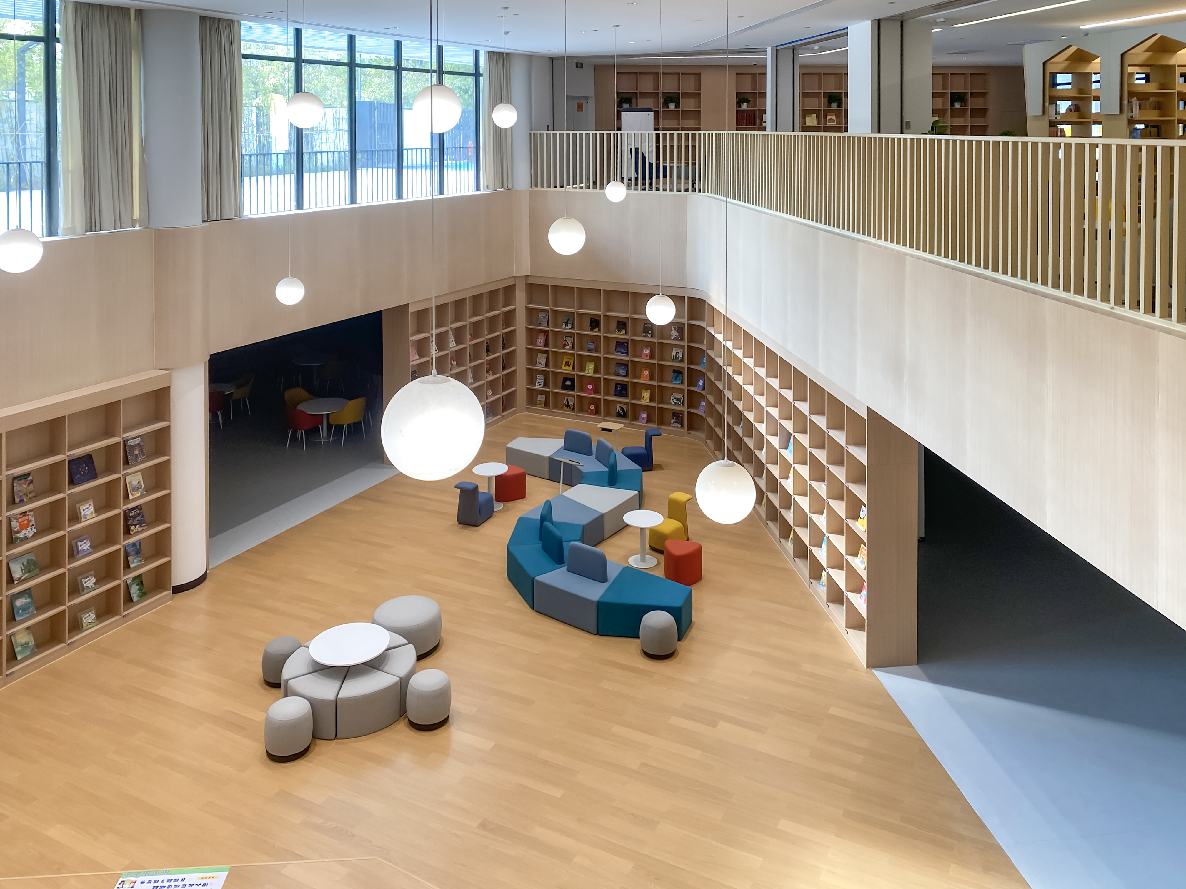学校空间设计集功能实用性和前瞻探索性为一体,设有约2000平方米的图书馆、可容纳800人的礼堂。除了常规实验室和功能课室外,学校还配备了STEAM工坊、创新探究实验室、国学启慧课室、心理发展中心、黑匣剧场、壁球室、武术室等新型功能场所,功能齐全、设施完备,为学生全力打造舒适智慧校园。